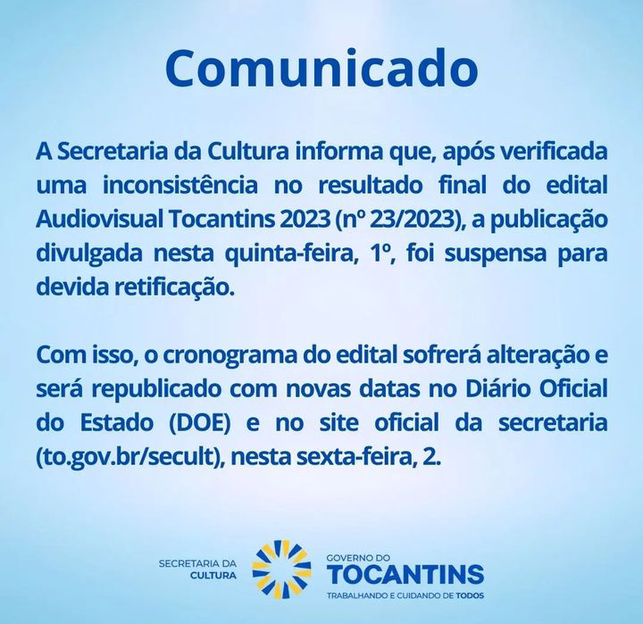 A Secretaria da Cultura informa que, após verificada uma inconsistência no resultado final do edital Audiovisual Tocantins 2023 (n° 23/2023), a publicação divulgada nesta quinta-feira, 1°, foi suspensa para devida retificação Com isso, o cronograma do edital sofrerá alteração e será republicado com novas datas no Diário Oficial do Estado (DOE) e no site oficial […]
