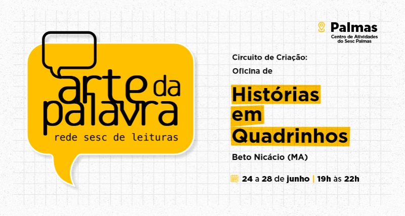 Serviço: Arte da Palavra – Circuito de Criação Oficina: Histórias em Quadrinhos, com Beto Nicácio (MA) Inscrições: Até o dia 24 de junho, pelo link: https://forms.office.com/r/A0C6cFNprS Data da oficina: 24 a 28 de junho Horário: 19h às 22h Classificação Indicativa: 16 anos Local: Centro de Atividades do Sesc Palmas (502 Norte) Mais Informações: [email protected] ou (63) 3212-9948 Se você tem interesse em aprender a […]