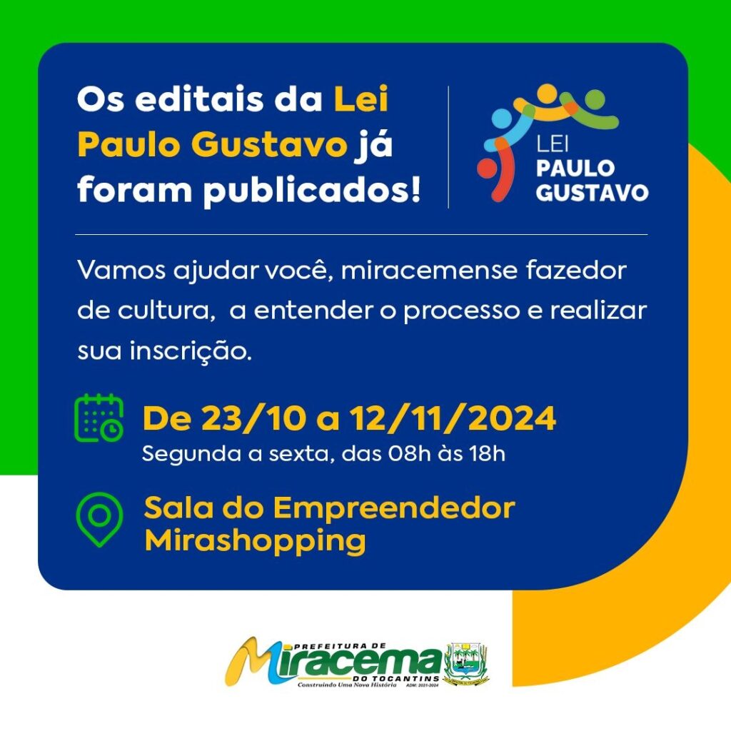 PREFEITURA DE MIRACEMA ABRE INSCRIÇÕES PARA EDITAIS CULTURAIS COM RECURSOS DA LEI PAULO GUSTAVO