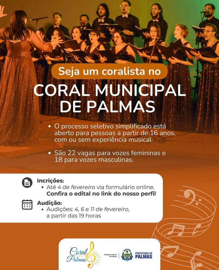 Quer fazer parte do Coral Municipal de Palmas em 2025? As inscrições já estão abertas! A Fundação Cultural de Palmas seleciona novos cantores para integrar o grupo neste ano. São 40 vagas disponíveis para maiores de 16 anos, sem exigência de formação musical. Inscreva-se até 4 de fevereiro via formulário online (link no perfil) Audições […]