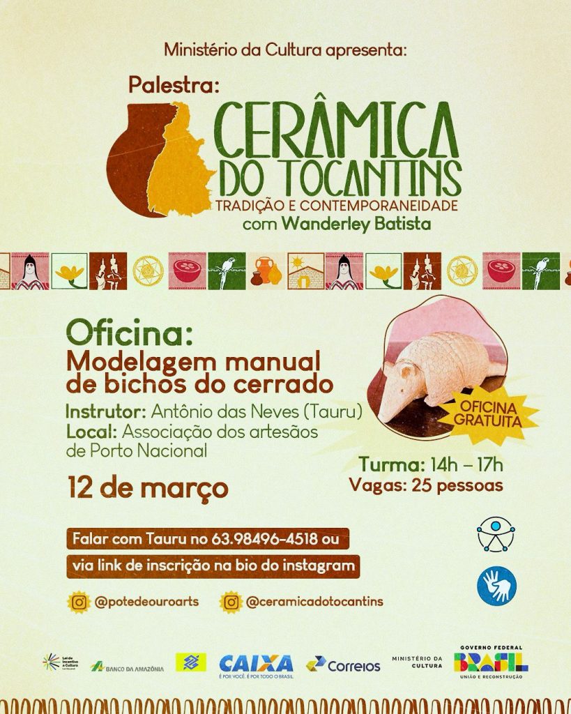 O projeto Cerâmica do Tocantins: Tradição e Contemporaneidade , realizado pela Pote de Ouro Arts, promove na próxima quarta-feira, 12, a Oficina de Modelagem Manual Bichos do Cerrado, voltada especialmente para crianças. A atividade acontece na Associação dos Artesãos de Porto Nacional, das 14h às 18h, proporcionando aos pequenos a oportunidade de aprender técnicas básicas […]