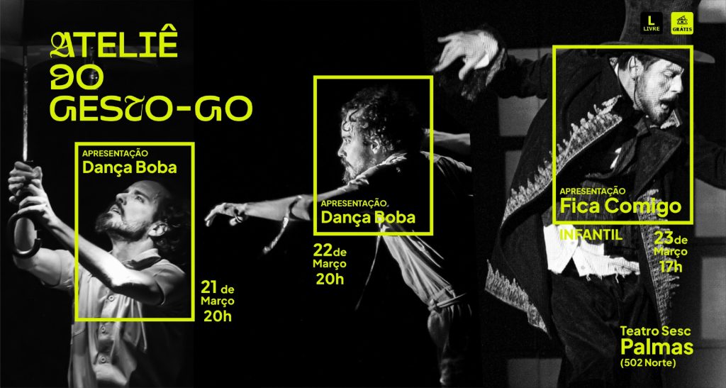 O Grupo Ateliê do Gesto, de Goiânia (GO), se apresenta ao público de Palmas no Teatro Sesc em espetáculos com entrada gratuita e classificação livre. As exibições serão realizadas nos dias 21 de março, às 20h, com o espetáculo “Dança Boba”, apresentação que se repetirá no dia 22, no mesmo horário, e no dia 23 […]