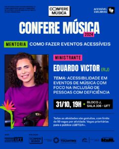 Trazendo para a programação uma discussão sobre acessibilidade dentro do contexto de eventos de música, a Confere inicia no dia 31/10, às 19h, com a mentoria “Como fazer eventos acessíveis”, ministrada pelo criador de conteúdo digital e midiólogo Eduardo Victor (RJ).