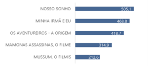 - As distribuidoras Warner e Disney ocuparam o topo do ranking de público, com mais de 79 milhões de ingressos comercializados conjuntamente; e