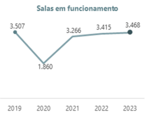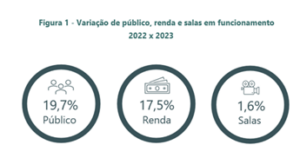 No entanto, apesar de não reestabelecidos os resultados do período pré-pandemia, o ano de 2023 apresenta números positivos, como o aumento de quase 20% no público e de 17,5% na renda. As salas faturaram R$ 2,2 bilhões com a venda de 114 milhões de ingressos em 2023. O parque exibidor encerrou 2023 com 3.468 salas abertas – variação positiva de 1,6% em relação a 2022, aproximando-se dos patamares de 2019 (3.507 salas).