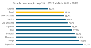 Utilizando a média de público dos três anos anteriores à pandemia de COVID-19 (2017-2019) em comparação aos dados de 2023, observa-se que a recuperação do mercado brasileiro neste período (65,5%) é inferior àquela alcançada por países como Argentina (92%), França (86,9%), Portugal (80,3%), México (67,9%), Estados Unidos e Canadá (65,7%).