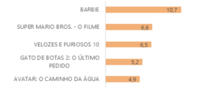 O mercado foi dominado pelos grandes lançamentos internacionais, destacando-se: “Barbie” (público de 10,7 milhões); “Super Mario Bros – O filme” (6,6 milhões); e “Velozes e Furiosos” (6,5 milhões).