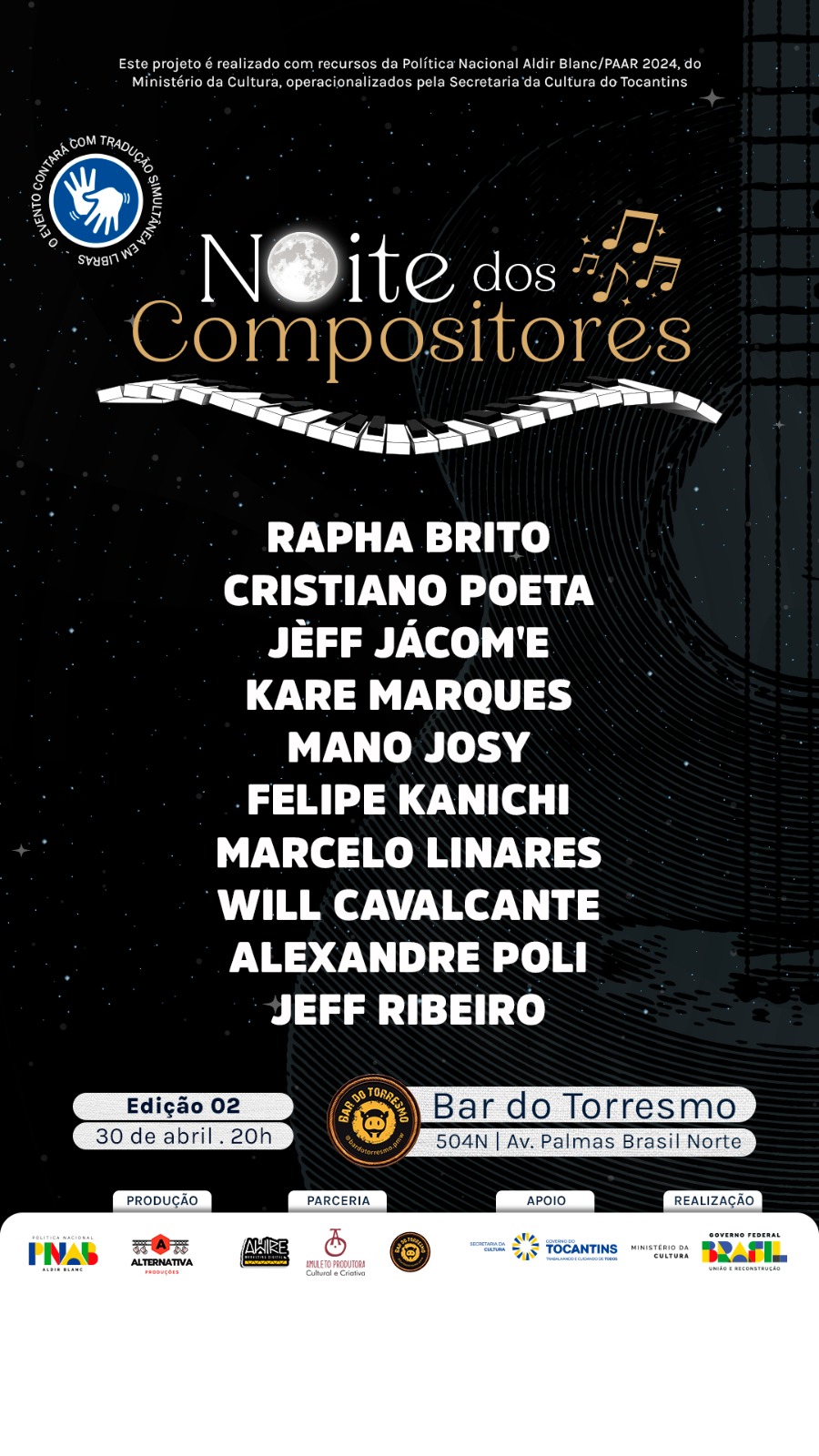 A nova geração da música autoral tocantinense tem encontro marcado na próxima quarta-feira, 30 de abril, às 20 horas, no Bar do Torresmo, em Palmas. Os dez artistas selecionados para a 2ª edição da Noite dos Compositores irão apresentar ao público composições autorais em um evento gratuito que celebra a diversidade e a força criativa da cena musical independente local.