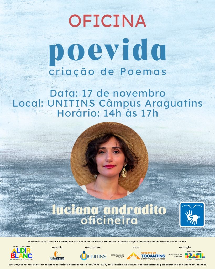 Estão abertas as inscrições para a Oficina Poevida – Criação de Poemas, com a escritora Luciana Andradito, que acontecerá no dia 17 de novembro, das 14h às 17h, no Câmpus Araguatins da Unitins. Voltada a poetas, escritores, artistas, estudantes, professores e interessados em literatura, a oficina tem como proposta sensibilizar os participantes por meio de […]