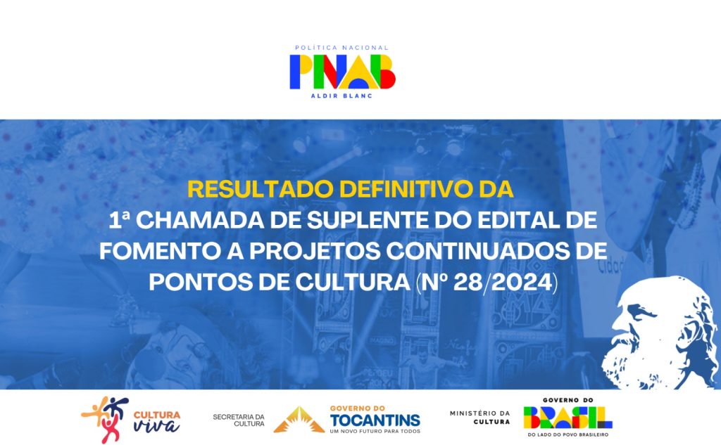 A Secretaria da Cultura do Tocantins (Secult) publica o resultado definitivo da 1ª chamada de suplente do edital de Fomento a Projetos Continuados de Pontos de Cultura (nº 28/2024), que faz parte da execução da Política Nacional Aldir Blanc (PNAB) no Tocantins. A publicação contempla a redistribuição de sobras dos editais nº 27 (Infraestrutura) e […]