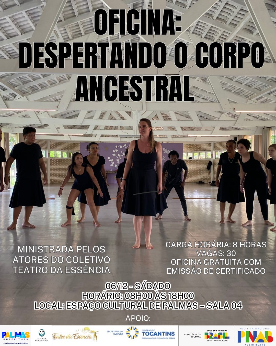 O Coletivo Teatro da Essência promove, no próximo sábado, 06 de dezembro, a oficina gratuita “Despertando o Corpo Ancestral”. A vivência, com 8 horas de duração, será realizada no Espaço Cultural José Gomes Sobrinho (Fundação Cultural de Palmas), na Sala 04, localizada na Av. Siqueira Campos, s/n, no 302 Sul. A ação é uma contrapartida do Projeto Bolsas Culturais – PNAB II, do Governo do Estado do Tocantins.