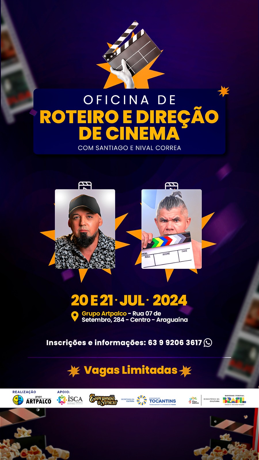 Com o objetivo de estimular o mercado de produção audiovisual no Norte do Estado, a empresa Artpalco Produções Cinematográficas realizará a Oficina de Roteiro de Cinema e Direção no próximo final de semana, dias 20 e 21, ao longo de todo o dia, em Araguaína. As vagas são limitadas e, para participar da oficina, as inscrições devem ser feitas pelo whats (63) 9 9206-3617.