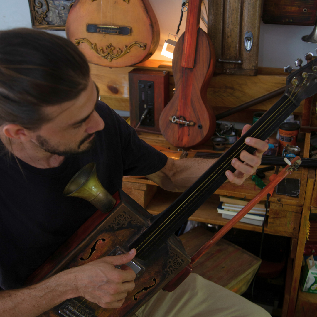 O acervo de cerca de 20 obras apresenta esculturas que transcendem os limites da forma e da função, transformando instrumentos musicais descartados em obras de arte inéditas. Com uma abordagem inovadora, Rafael Naufel utiliza a técnica de montagem, unindo conhecimentos de luthieria e engenharia mecânica para criar instrumentos que não apenas encantam visualmente, mas que também geram sons complexos e únicos.