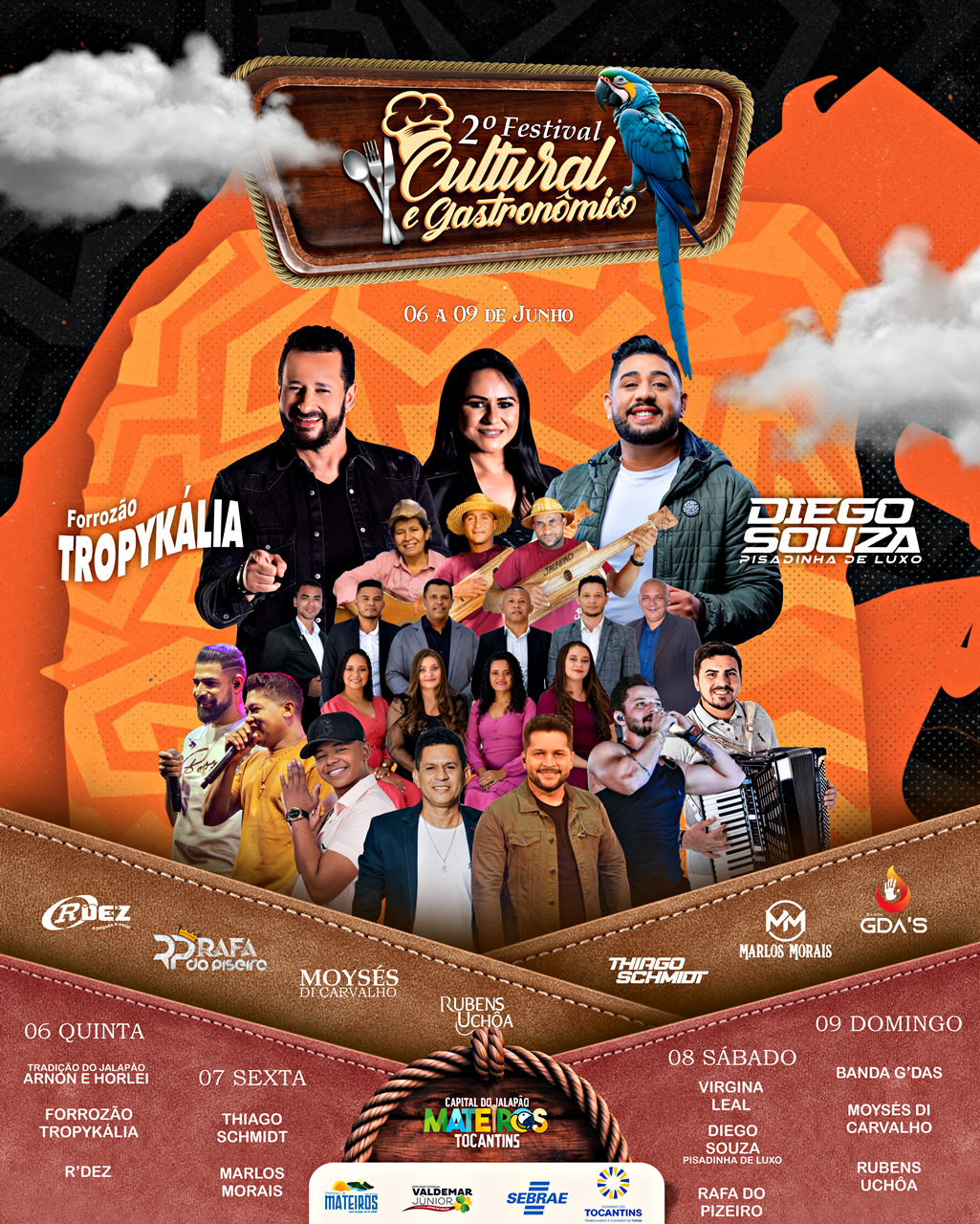 A programação já inicia nesta quinta-feira, 6, com estandes que irão expor as delícias gastronômicas da região e outros itens, além de show da dupla jalapoeira Arnon e Horlei, banda R’Dez e a principal atração, a banda de renome nacional Tropykália. Já nesta sexta, 7, o palco será comandado pelo cantor Thiago Schmidt e apresentação de Marlos Morais. A noite ainda será especial, pois contará com a escolha da Miss Mateiros, com belas garotas na passarela, que irão mostrar toda a beleza e força das jalapoeiras.