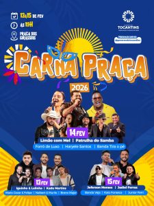 O Governo do Tocantins, por meio da Secretaria de Estado do Turismo (Setur), anunciou a programação do Carnaval 2026, que será realizada entre os dias 13 e 15 de fevereiro, na Praça dos Girassóis, em Palmas. Denominado Carnapraça, o evento reunirá atrações nacionais como a dupla Iguinho e Lulinha, a banda Limão com Mel, os cantores Kadu Martins e Jefferson Moraes, além de outros artistas regionais dos gêneros sertanejo, forró e pagode, que garantirão animação para todos os públicos.