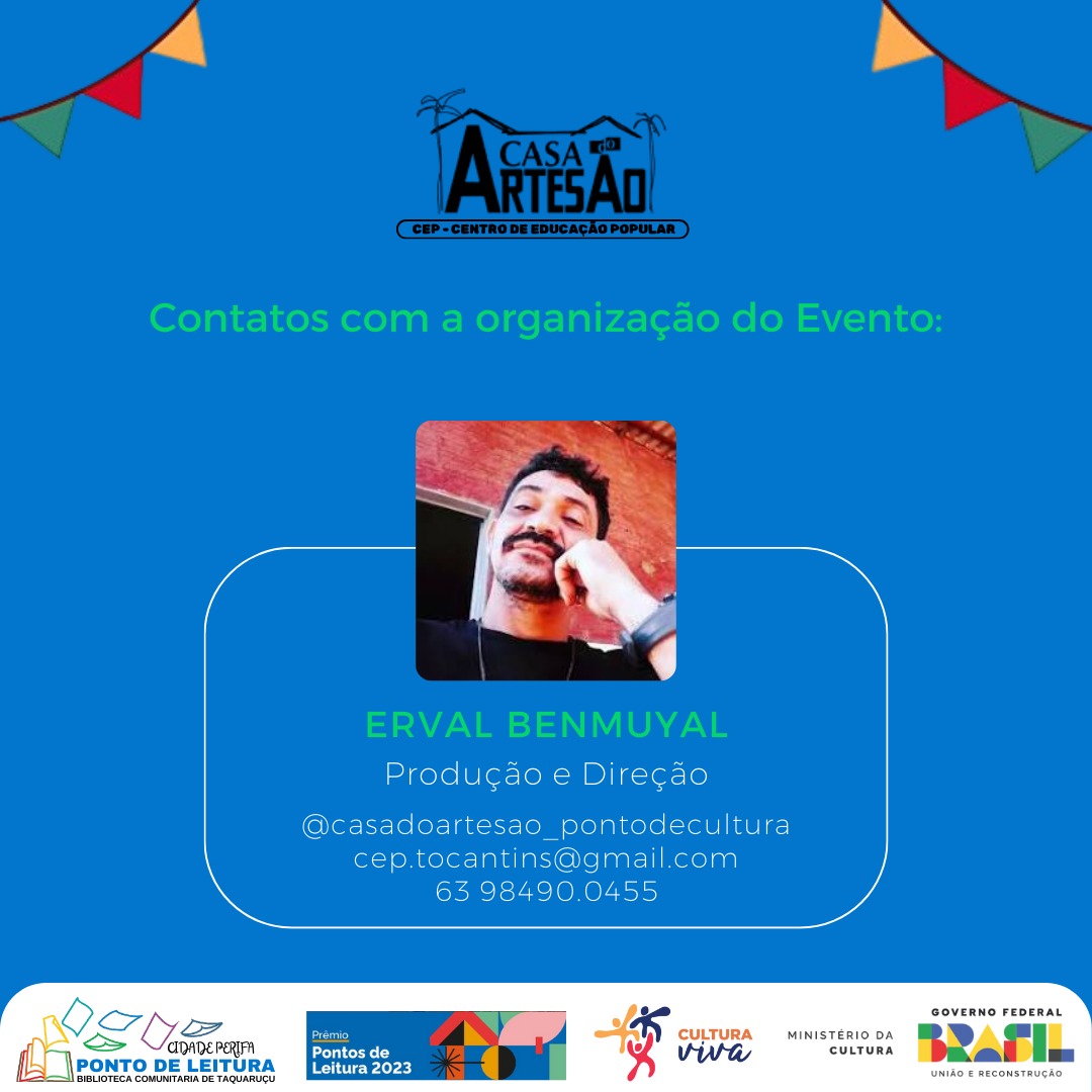 Este evento é uma manifestação viva da herança e riqueza cultural de Taquaruçu, apoiado pelo Governo Federal – Ministério da Cultura através do prêmio Pontos de Leitura 2023 da Secretaria de Formação Livro e Leitura e do prêmio Sérgio Mamberti do Programa Cultura Viva da Secretaria da Diversidade Cultural. A celebração também integra a campanha Cultura Viva Pelo Brasil, que comemora os 20 anos da Política Nacional Cultura Viva (PNCV), uma das principais iniciativas para fortalecer a cultura nos territórios e garantir os direitos culturais da população brasileira.