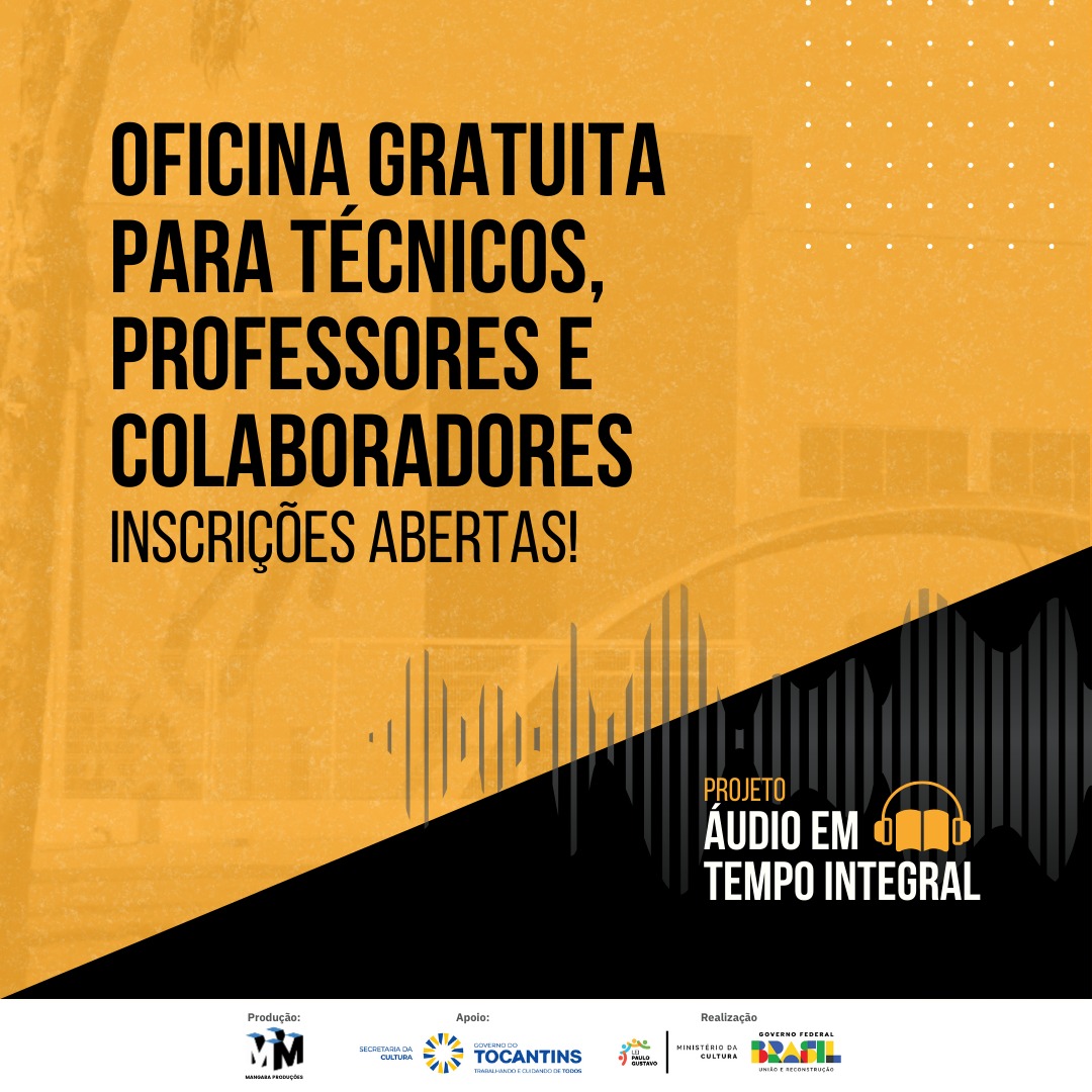 A oficina “Áudio em Tempo Integral” disponibilizará 50 vagas gratuitas para técnicos, professores e colaboradores das 23 Escolas Estaduais e Municipais de Tempo Integral de Palmas. As inscrições estarão abertas de 02 a 13 de setembro e podem ser realizadas através do link disponível aqui, com prioridade para aqueles que já atuam nos auditórios das escolas da rede pública de ensino.