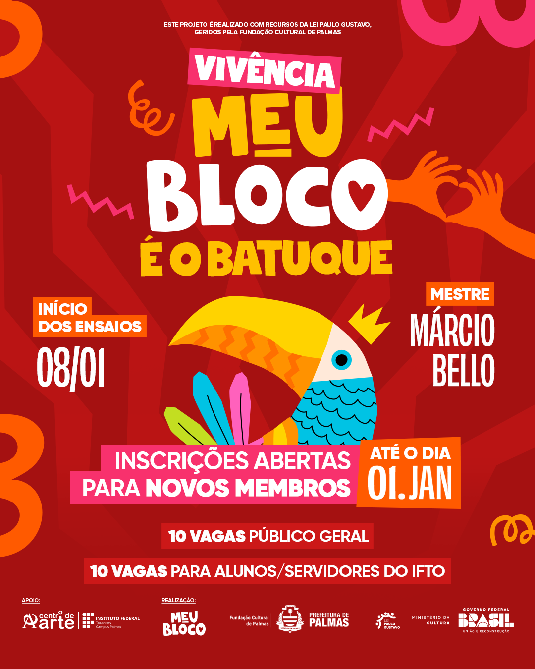 Este projeto é realizado com recursos da Lei Paulo Gustavo, geridos pela Fundação Cultural de Palmas. As inscrições podem ser realizadas pelo formulário online, disponível aqui: https://bit.ly/ensaiosmeubloco