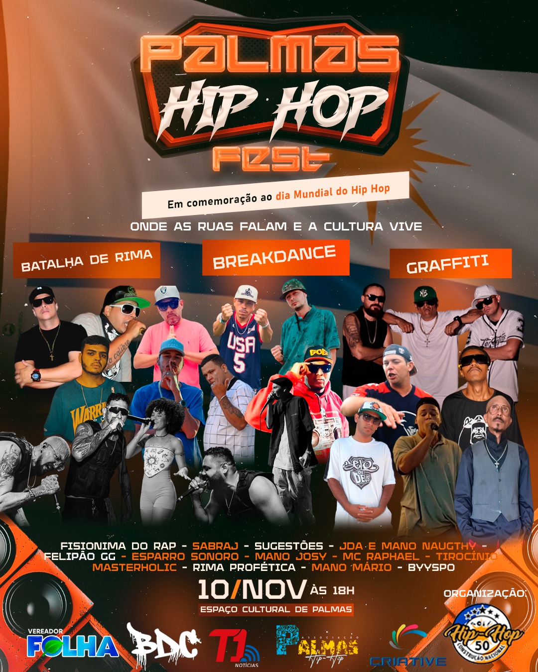 Para celebrar o Dia Mundial do Hip Hop e os 51 anos dessa cultura, Palmas receberá a primeira edição do Palmas Hip Hop Fest no dia 10 de novembro de 2024 (domingo) , a partir das 18h, no Espaço Cultural de Palmas – TO. O evento, com o tema “Onde as ruas falam e a cultura vive”, promete reunir expressões artísticas da cultura hip-hop, como o rap, graffiti, DJing e break dance, em uma festa vibrante e acessível a toda a comunidade.