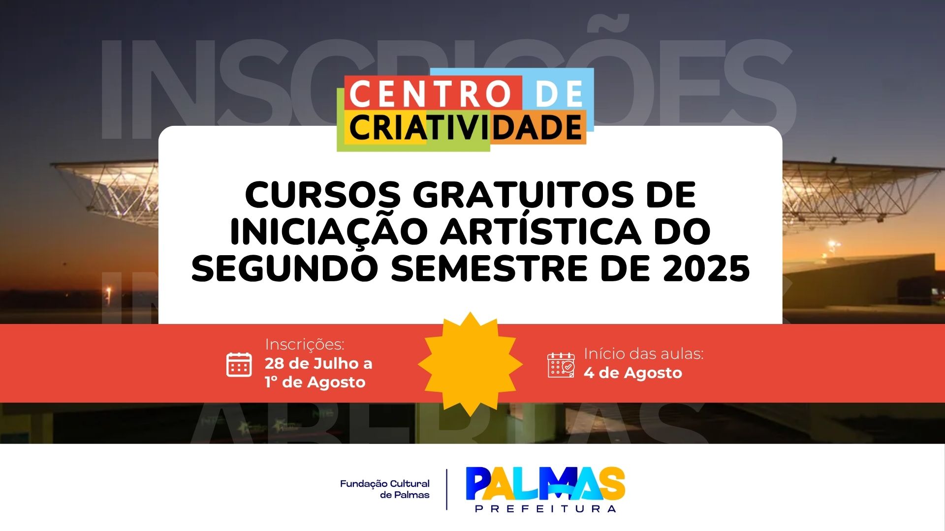 A partir da segunda-feira próxima, 28, a Prefeitura de Palmas, através da Fundação Cultural de Palmas (FCP), abre o processo de inscrições gratuitas para as turmas de iniciação artística do 2º semestre de 2025 dos cursos do Centro de Criatividade. Ao todo, são 668 novas vagas nas áreas da música, teatro, dança, artes visuais, artesanato e pintura.