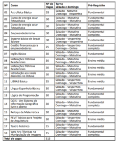 Com duração de 80 horas, os cursos serão ministrados nos finais de semana, aos sábados e domingos, nos horários matutino (das 8h às 12h), vespertino (das 14h às 18h) e/ou noturno (das 18h30 às 21h30), conforme descrito no edital.