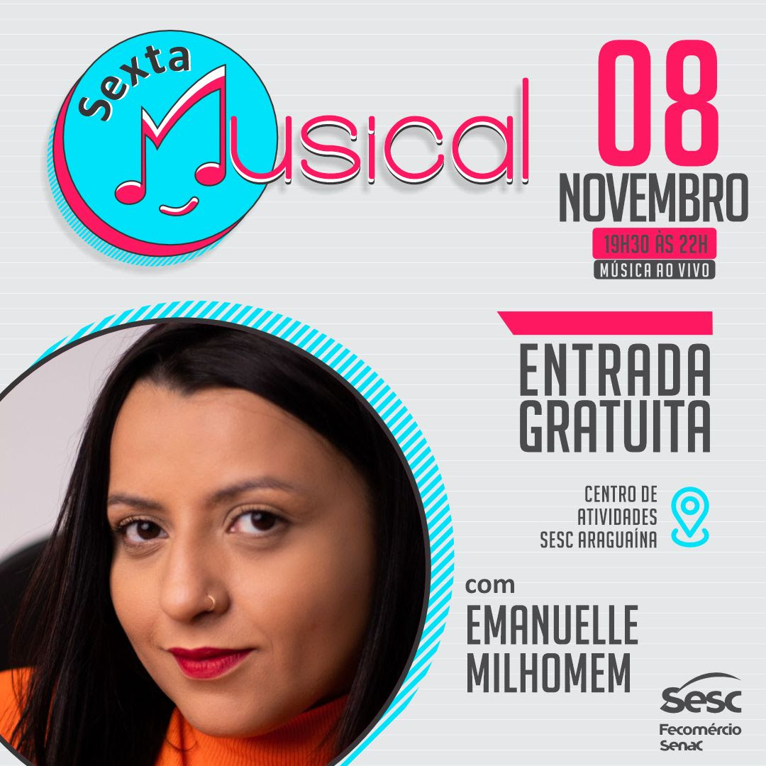 Sextou? O projeto Sexta Musical recebe a artista Emanuelle Milhomem no Centro de Atividades Sesc Araguaína, no dia 08 de novembro. A programação é gratuita e começa a partir das 19h. Não deixe de sextar com o Sesc e curtir uma música ao vivo!