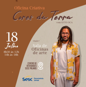 Neste mês de julho, a Galeria de Artes do Sesc Palmas está com inscrições abertas para a Oficina Criativa Cores da Terra, mediada pelo artista Guto Oca. A oficina acontece no dia 18 de julho, das 8h30 às 12h e das 14h às 18h, na Galeria de Artes do Centro de Atividades do Sesc em Palmas.
